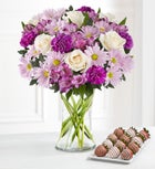 1029-P-192909We’ve brought together classic beauty and sweet indulgence, creating one unforgettable gift. Our fresh-from-the-garden bouquet in soothing shades of lavender and white is bundled with one dozen of our signature dipped & drizzled berries to make every romantic milestone or everyday “I love you” mean even more.